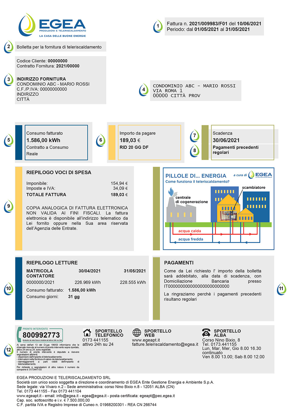 - FORNITURA: specifica la tipologia di fornitura (teleriscaldamento) a cui è riferita la bolletta.